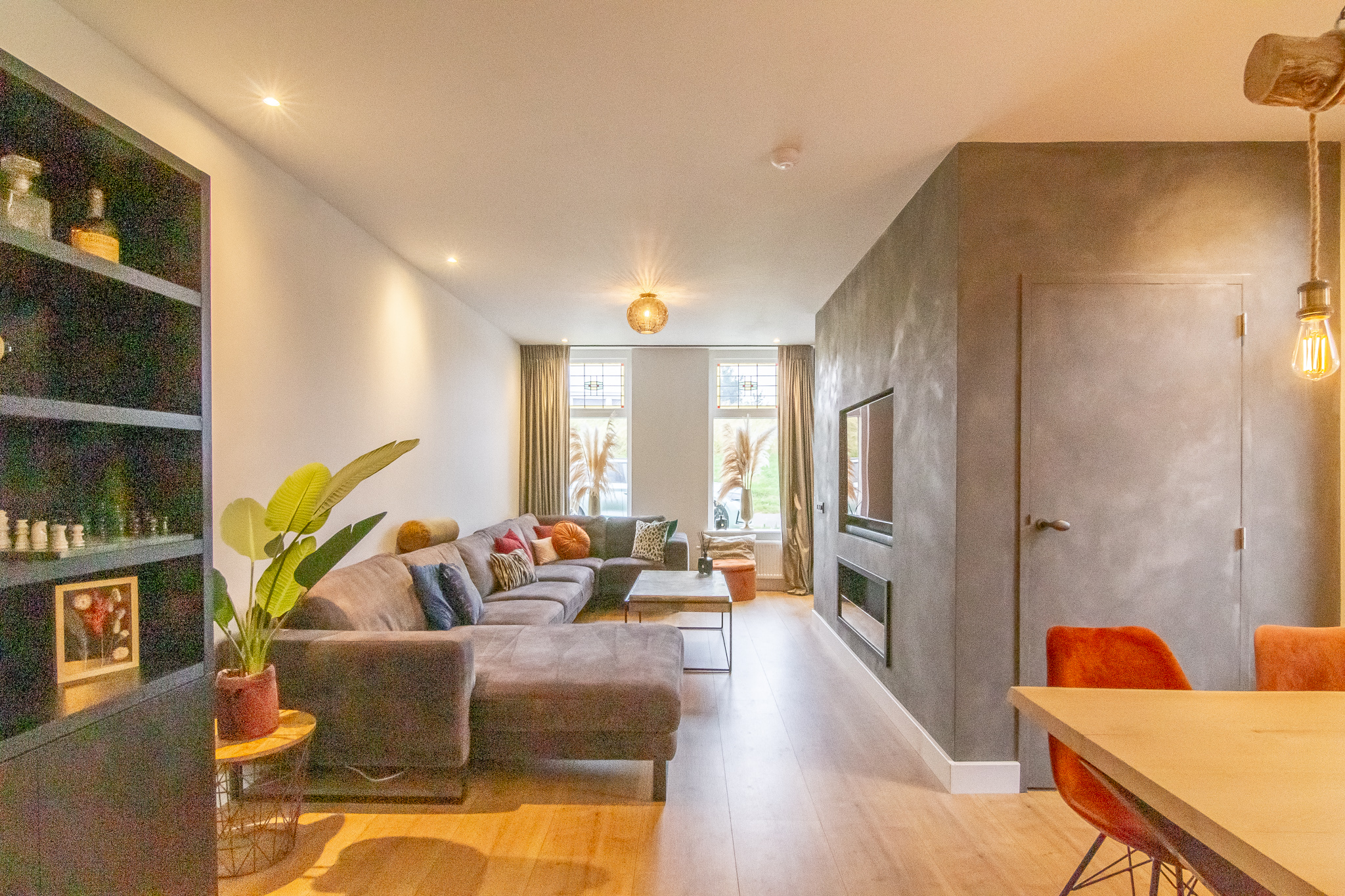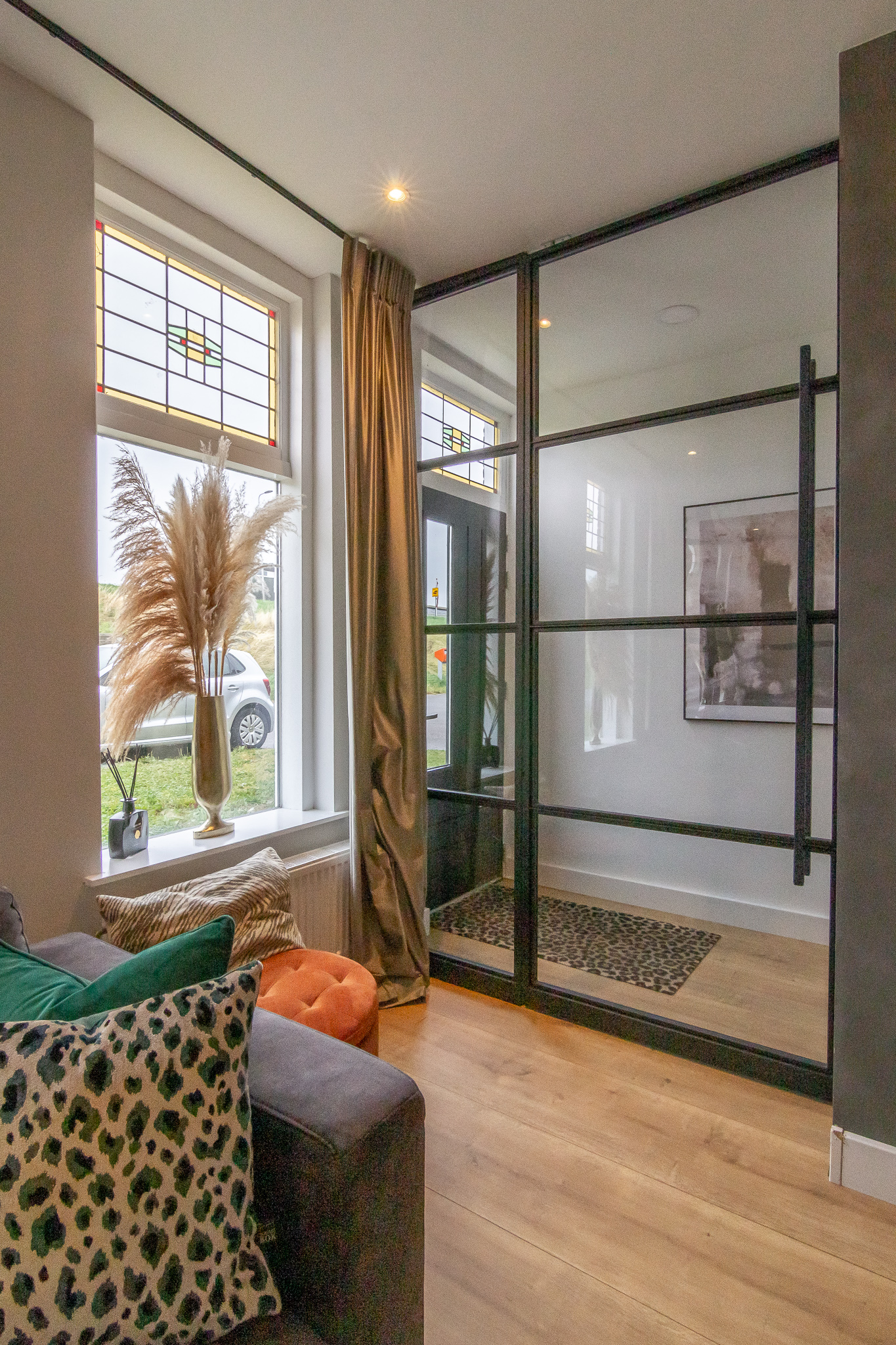 Heerlijk ruime woonkamer met veel lichtinval, prachtige glas-in-lood ramen, ruime trapkast en laminaatvloer.