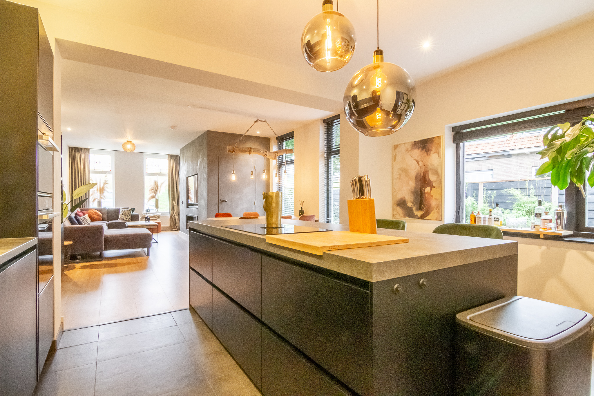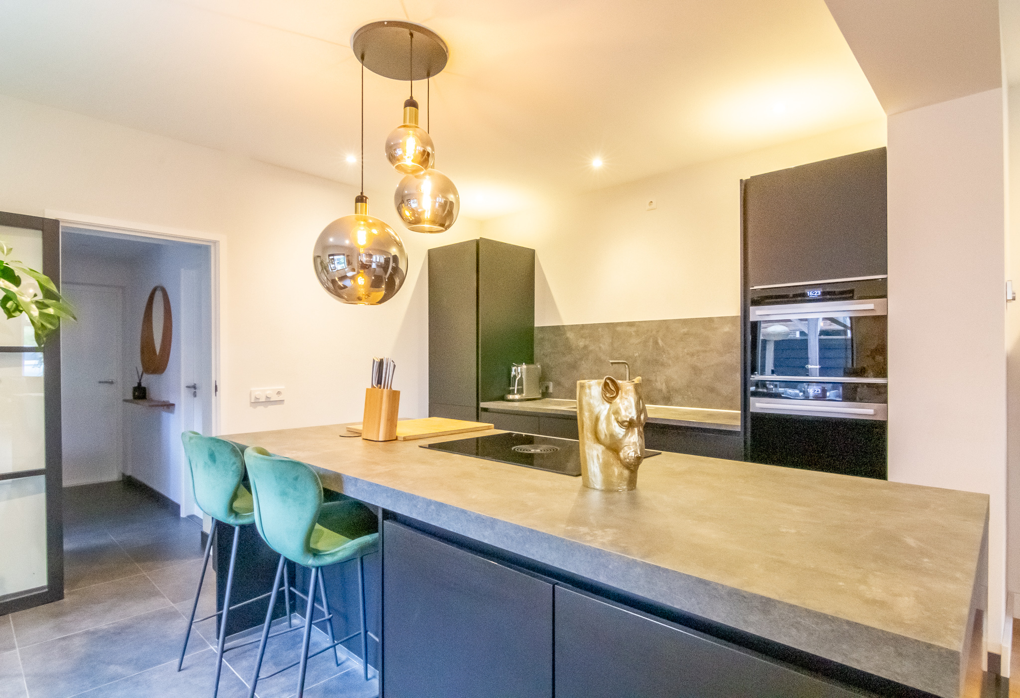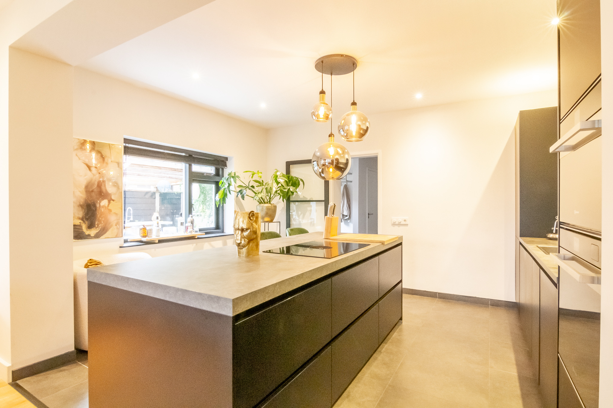 Open keuken voorzien van plavuizenvloer (met vloerverwarming) en modern hoekblok met koelkast, inductiekookplaat, afzuigkap en combi-oven.