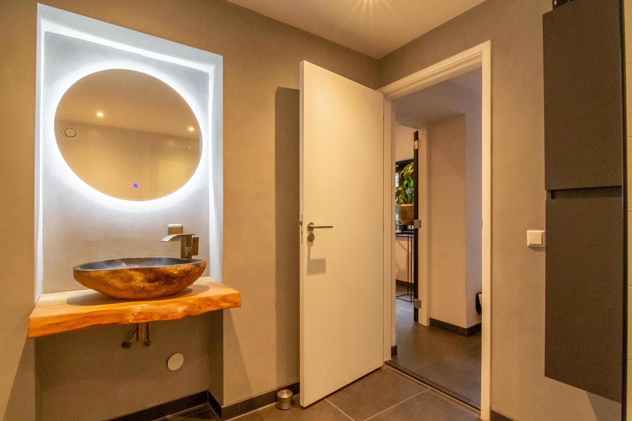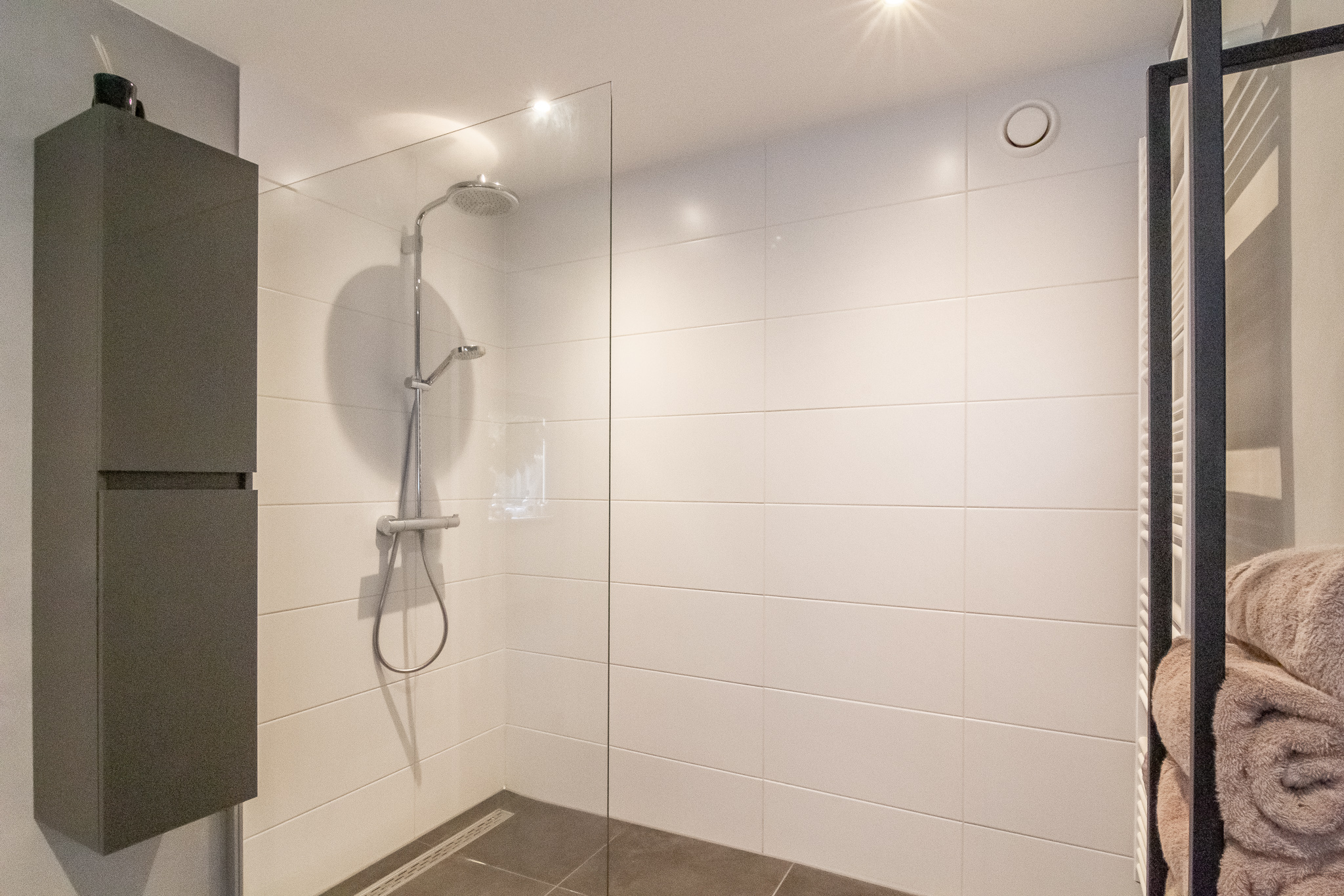 Indeling begane grond: Entree aan de zijkant, hal met garderobe en toiletruimte met wandcloset en fonteintje. Badkamer (1) met vloerverwarming, XL inloopdouche, wastafelmeubel, designradiator, mechanische ventilatie en inbouwspots.