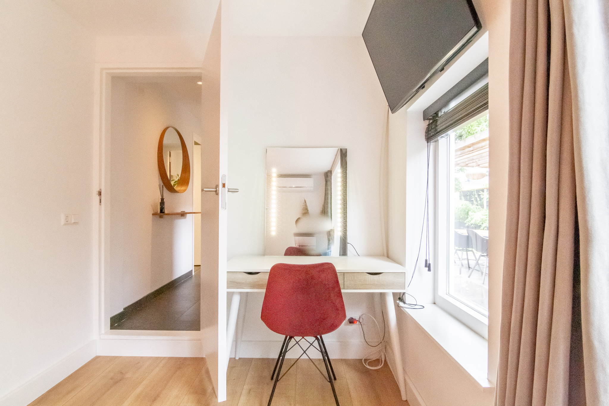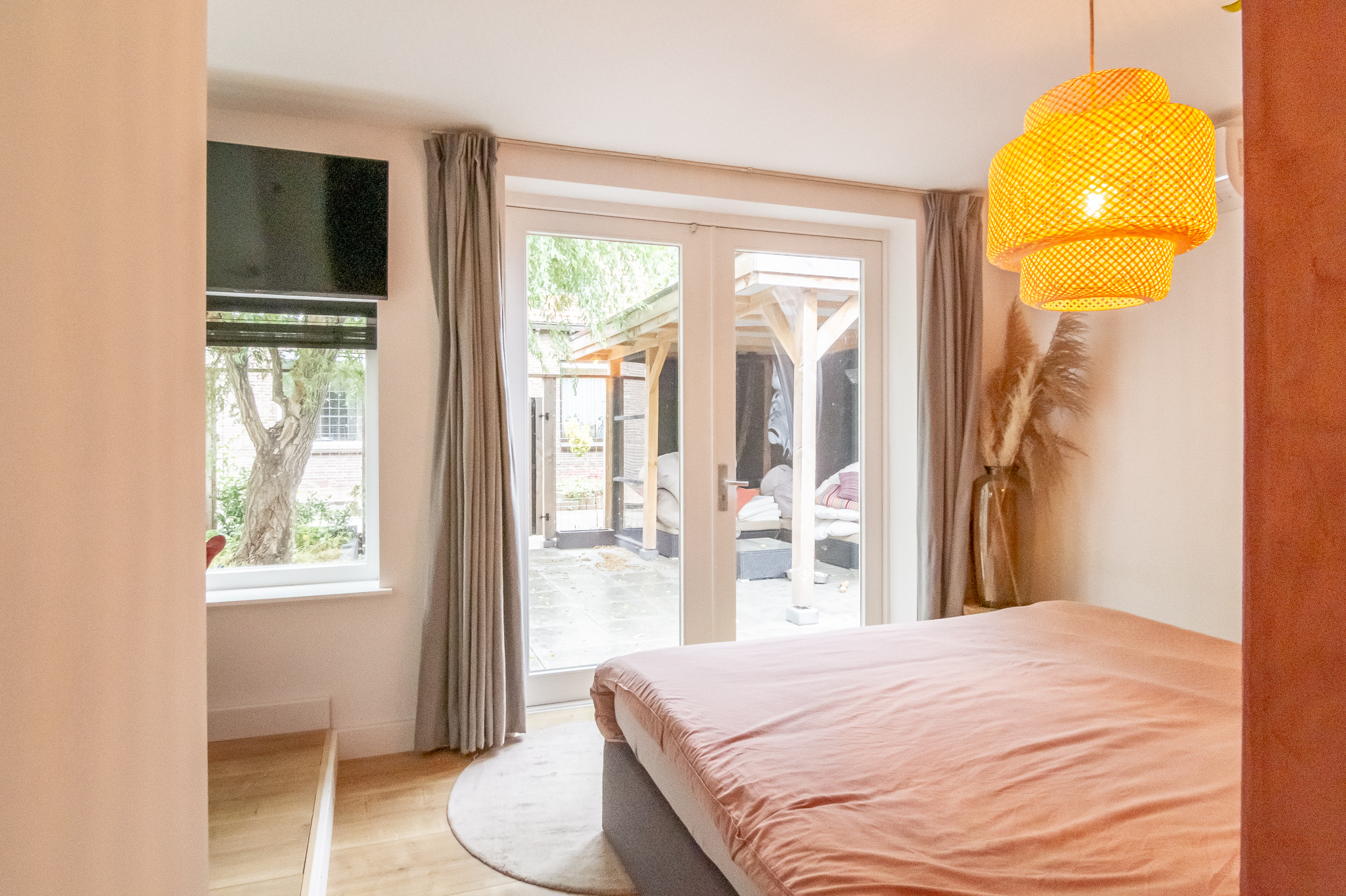Slaap-/werkkamer (1) met openslaande deuren naar de tuin. Technische ruimte met opstelplaats CV-combiketel, unit mechanische ventilatie en wasmachineaansluiting.