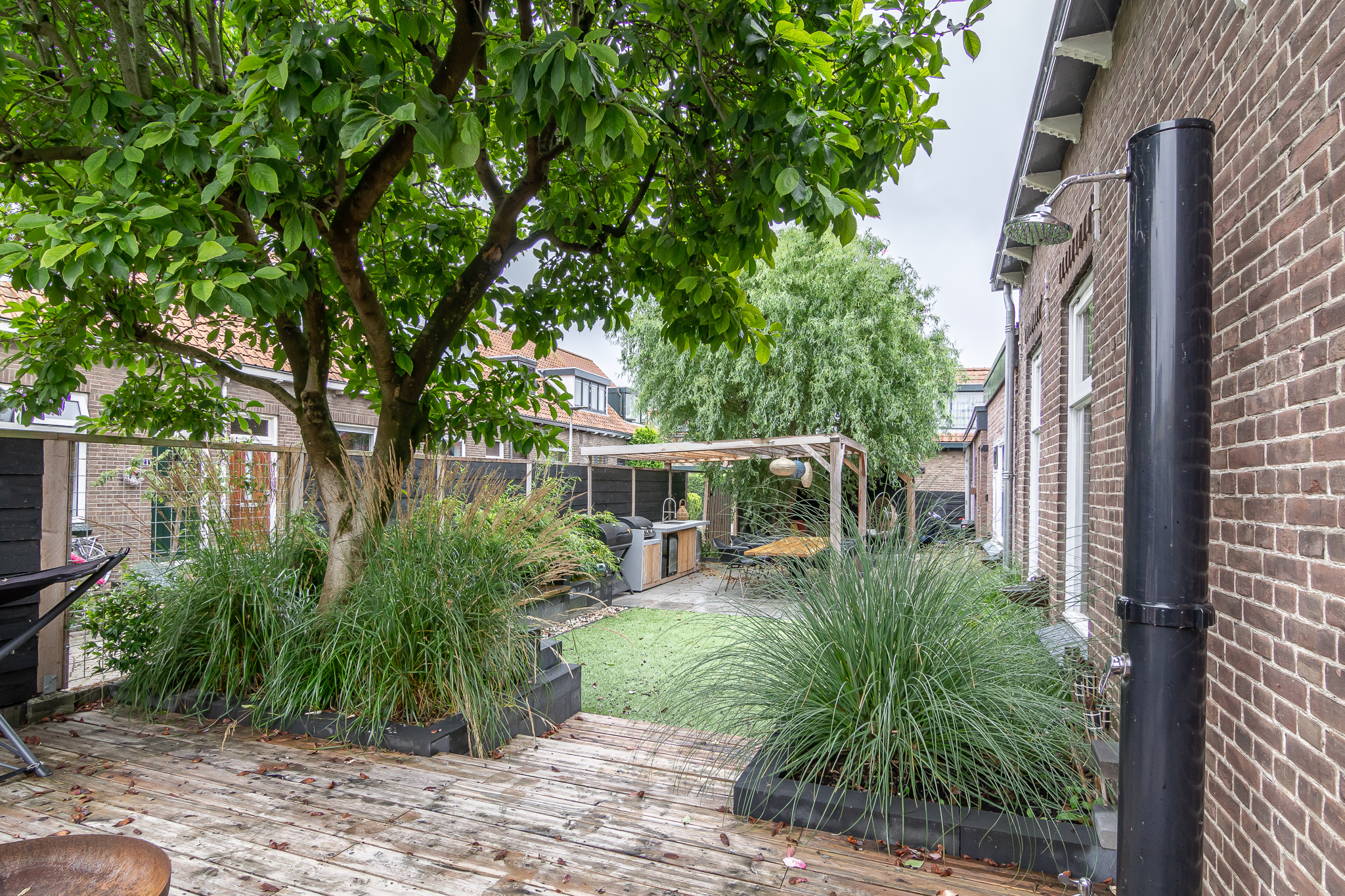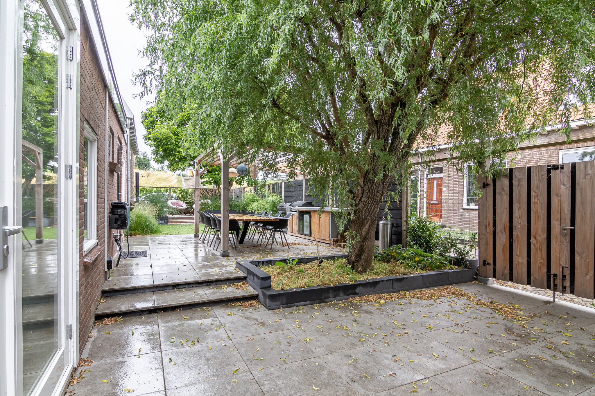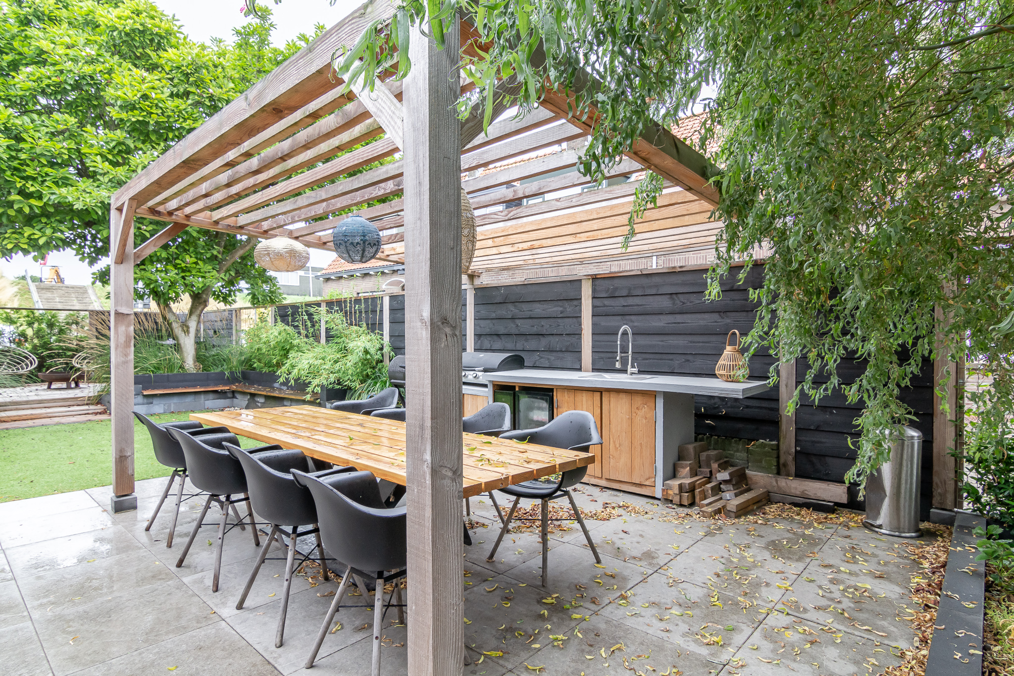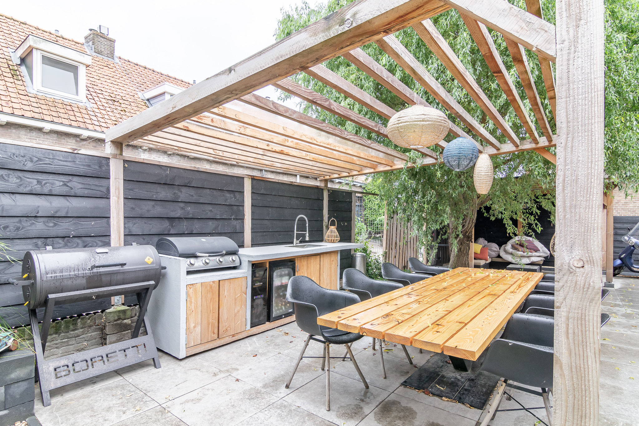 De (onderhoudsvriendelijke) tuin beschikt over diverse loungebanken, zitjes en hoekjes en een grote BUITENKEUKEN welke voorzien is van allerlei apparatuur, waaronder een koelkast, barbecue en kooktoestel.