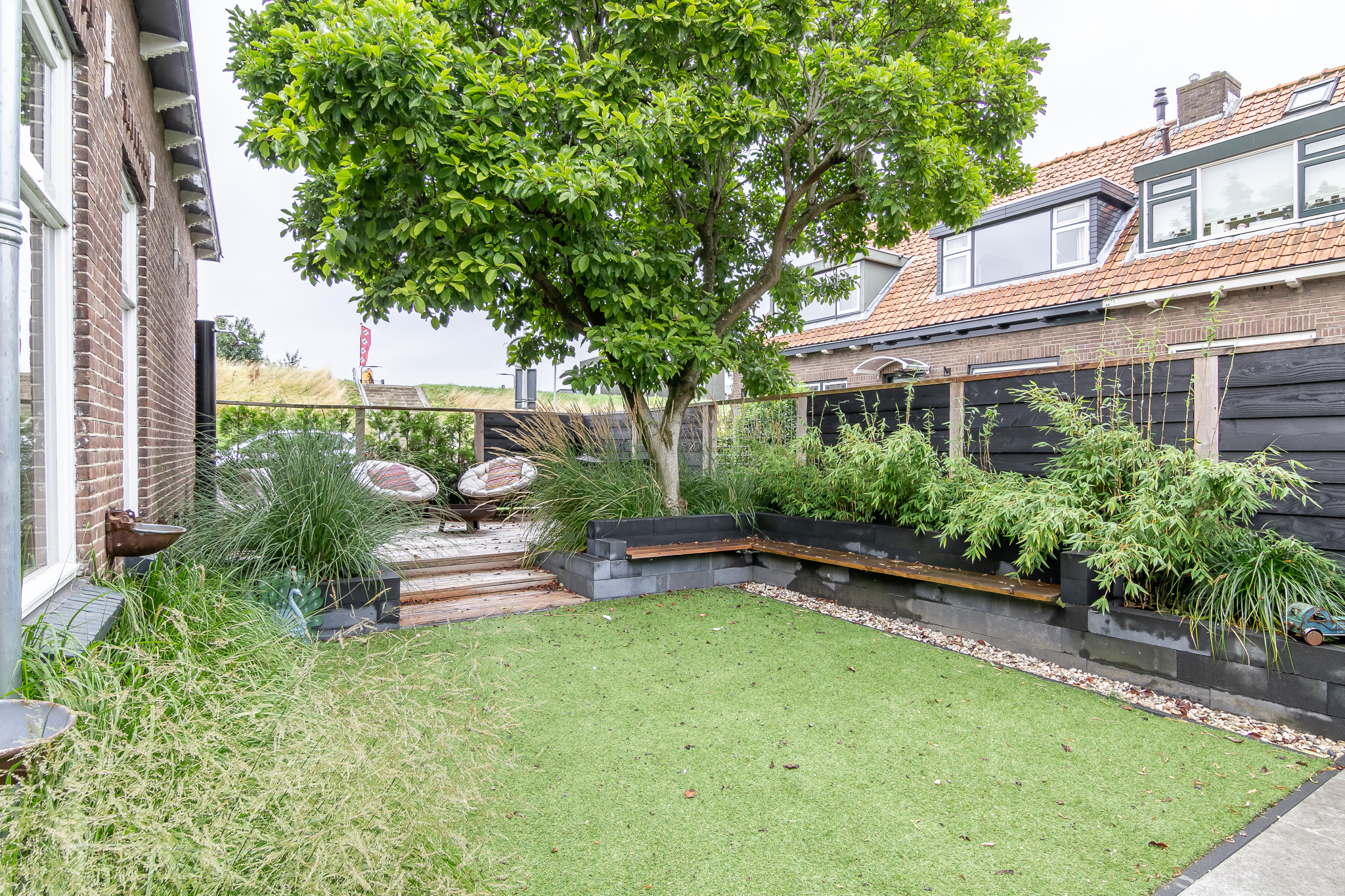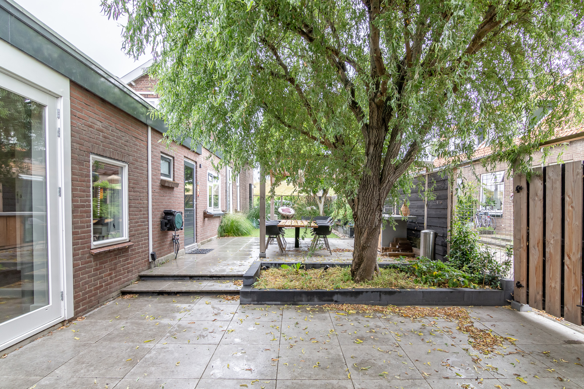 Buiten: Tuin rondom de woning, waarbij de zijtuin 5.50 breed en 23.00 m lang is!