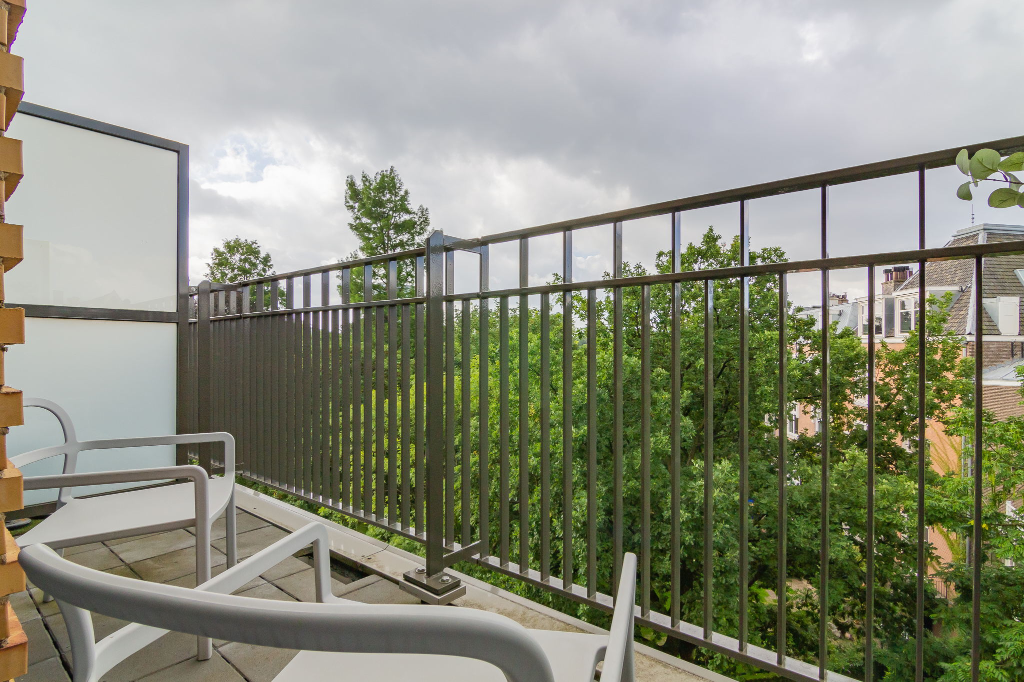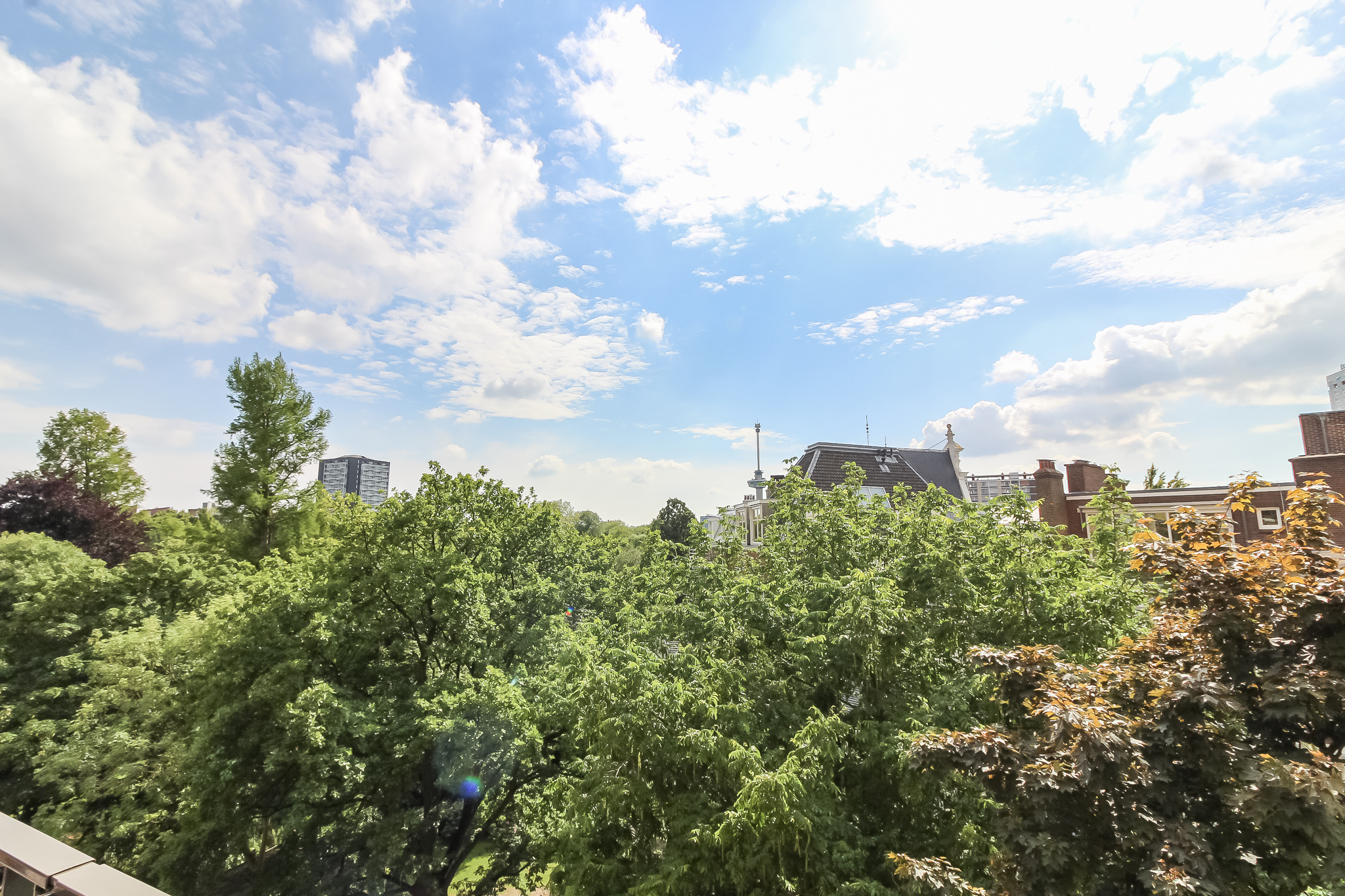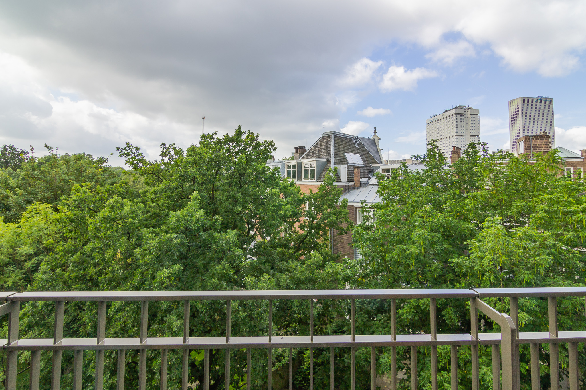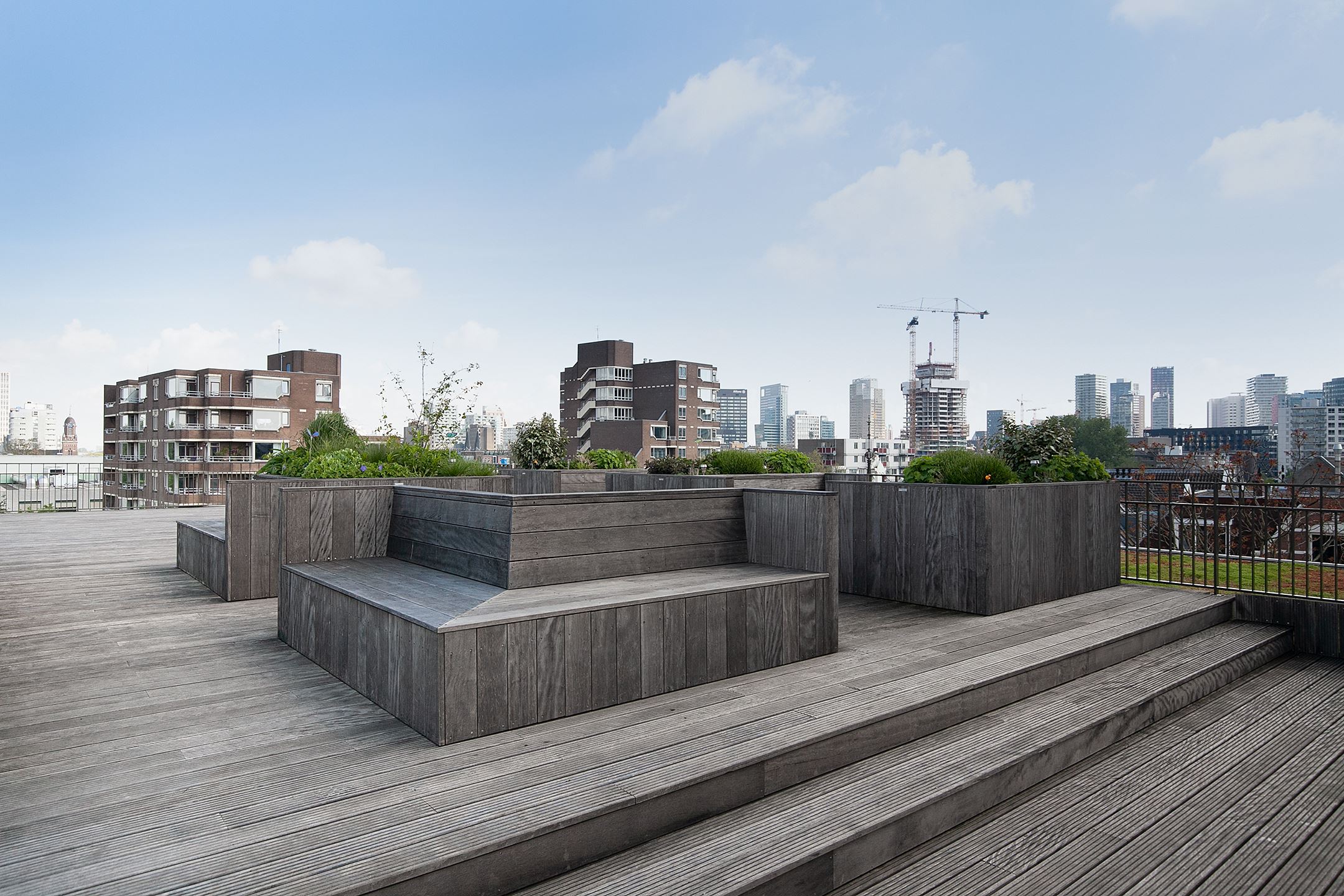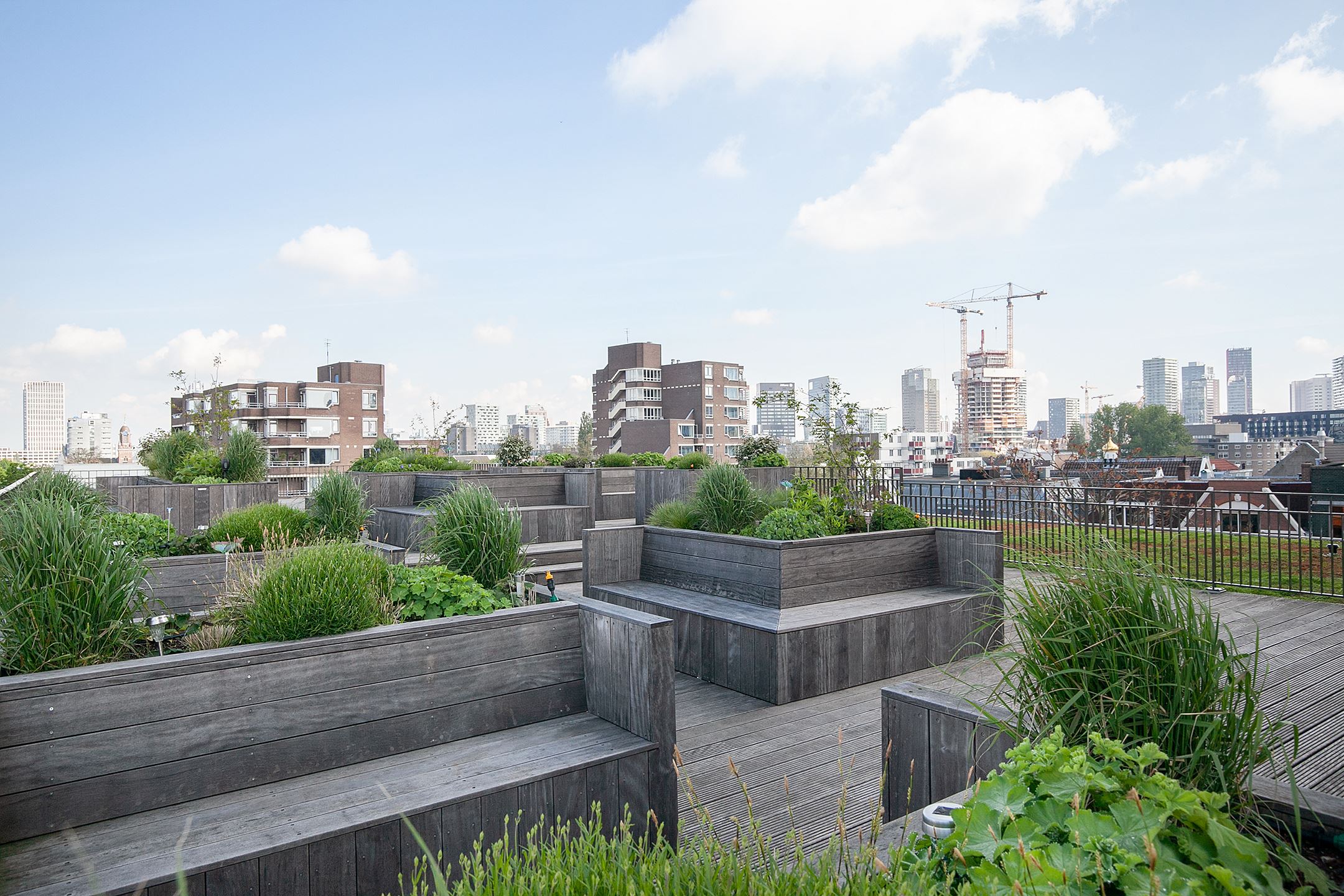 Op de 5e verdieping bevindt zich een royaal gemeenschappelijk dakterras met bankjes, beplanting en een weids uitzicht over het centrum van Rotterdam. Het is hier heerlijk toeven (zie foto's)!
