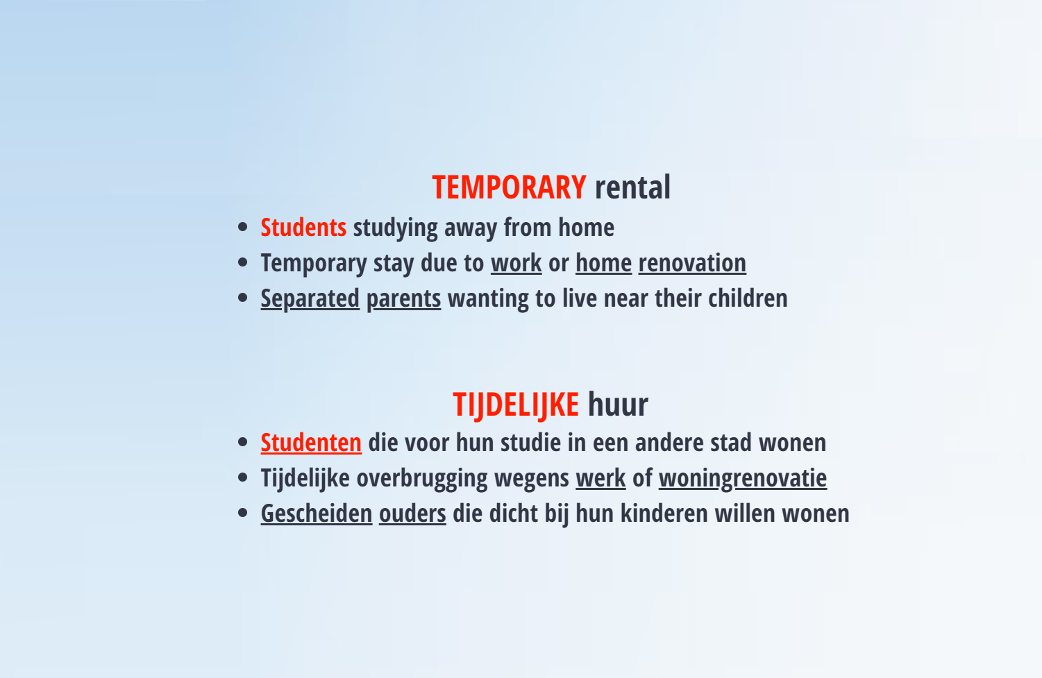 - Tijdelijk elders wonen vanwege werk of renovatie van de eigen woning;